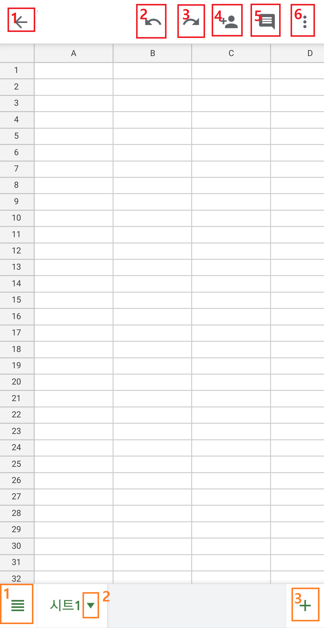 또한, 이미지의 하단부에 위치한 메뉴/버튼(주황색 박스 표시)들은 '작업 중인 시트 자체에 대한 기능'이 모여있습니다.