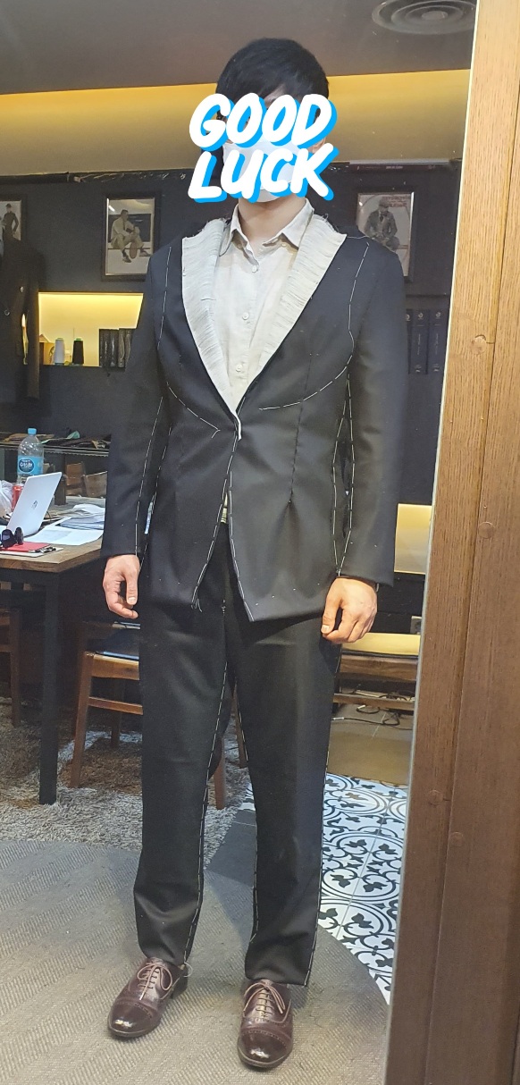 첫날 선택한 디자인과 측정한 치수를 기반으로 반수 제로 만든 예복을 우선 입어보고 수정이 필요한 부분에 대해서 신랑과 직접 의견을 교류하며 체크하십니다. 대략 30분? 정도 소요되는 것 같습니다.