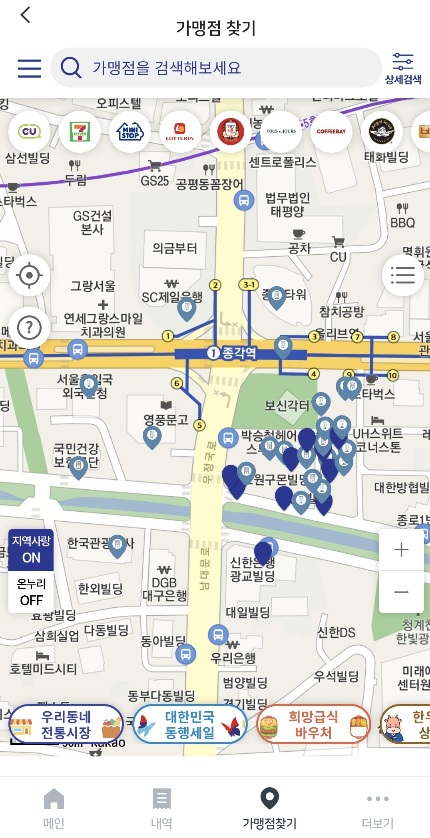 위 메인 화면에서 8번으로 표시한 '가맹점 찾기' 버튼 클릭 시 표시되는 화면