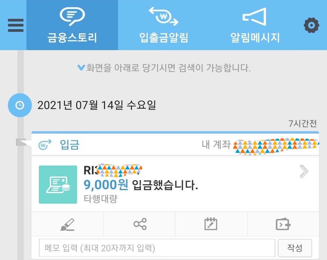 보통 입금자 혹은 입금사 이름이 표시되는 부분에 'RI#######'의 형식으로 표시된 항목이 바로 제로 페이 환불 요청으로 입금된 사항입니다.