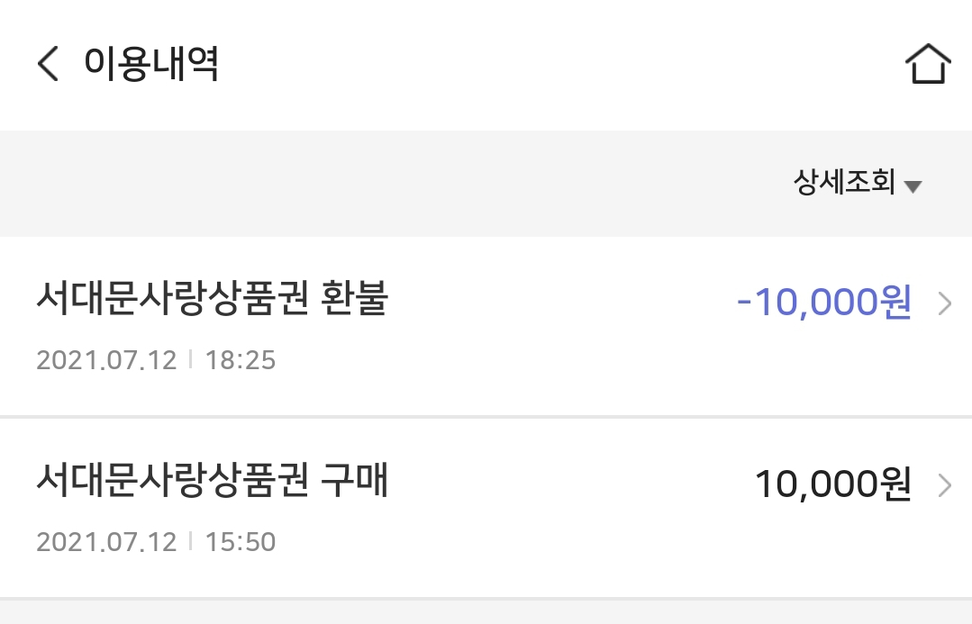 STEP 2. 아래와 같이 방금 결제한 '서대문사랑 상품권' 환불 내역이 표시됩니다.