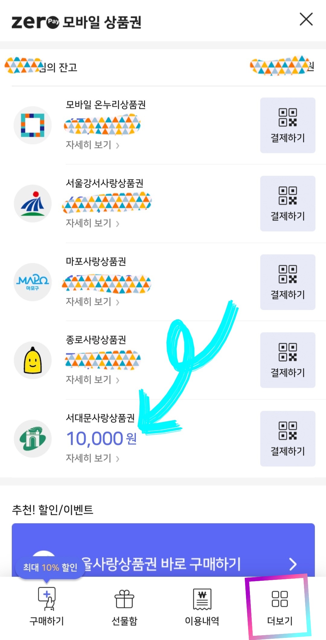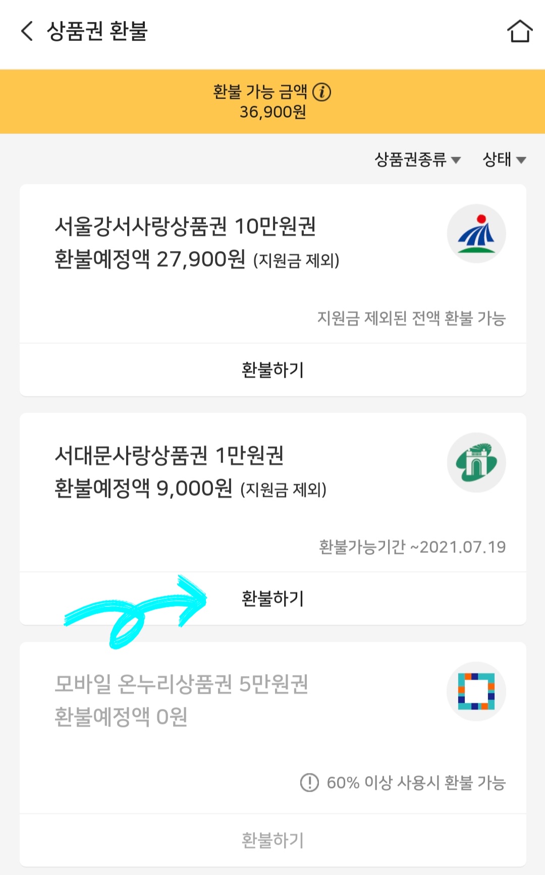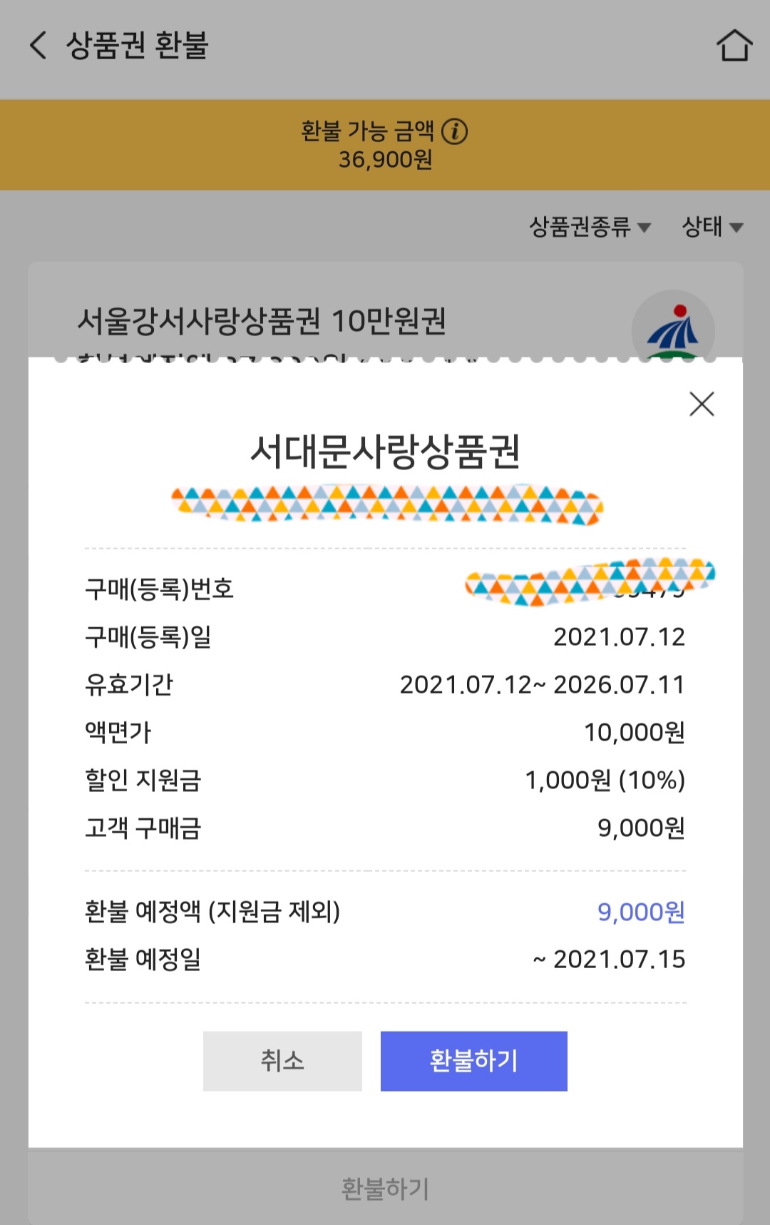 * 아래 이미지에서 '서대문사랑 상품권'의 경우 환불 가능 기간 내에 환불할 예정이기 때문에 전액 환불 가능합니다.