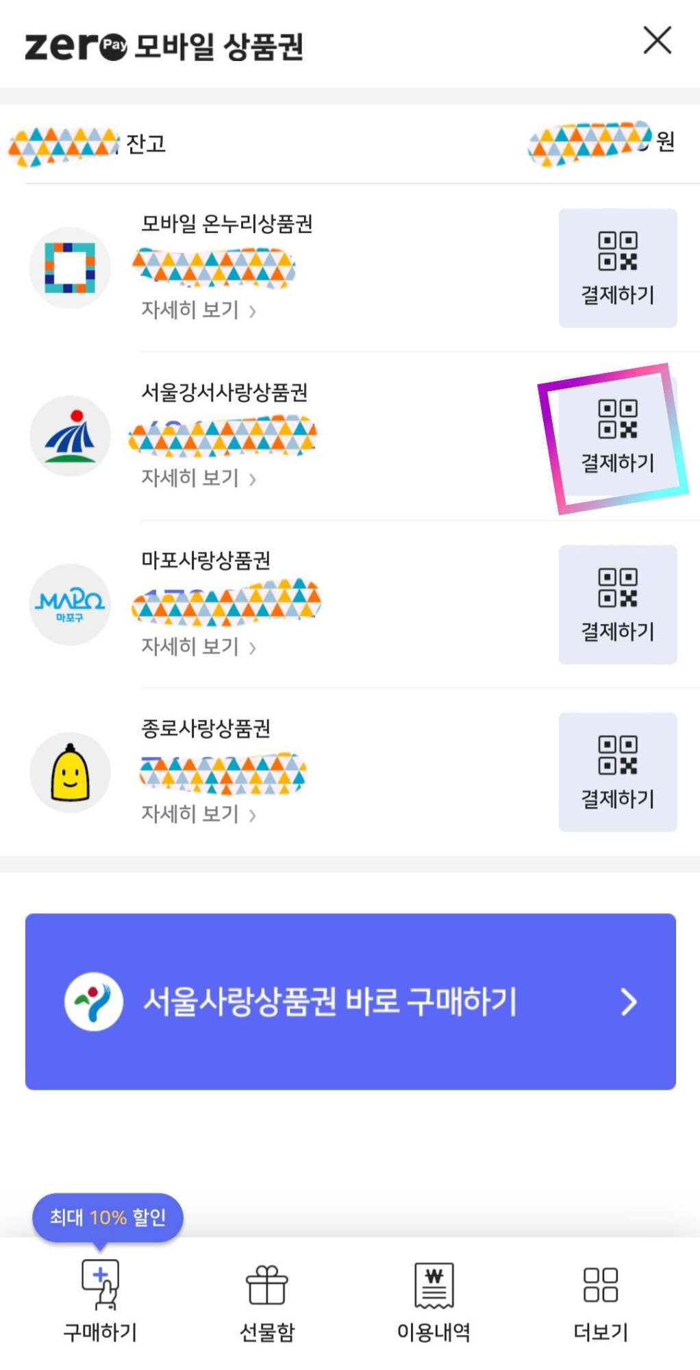 STEP 3. 사용할 상품권의 우측에 위치한 '결제하기' 버튼을 클릭합니다.