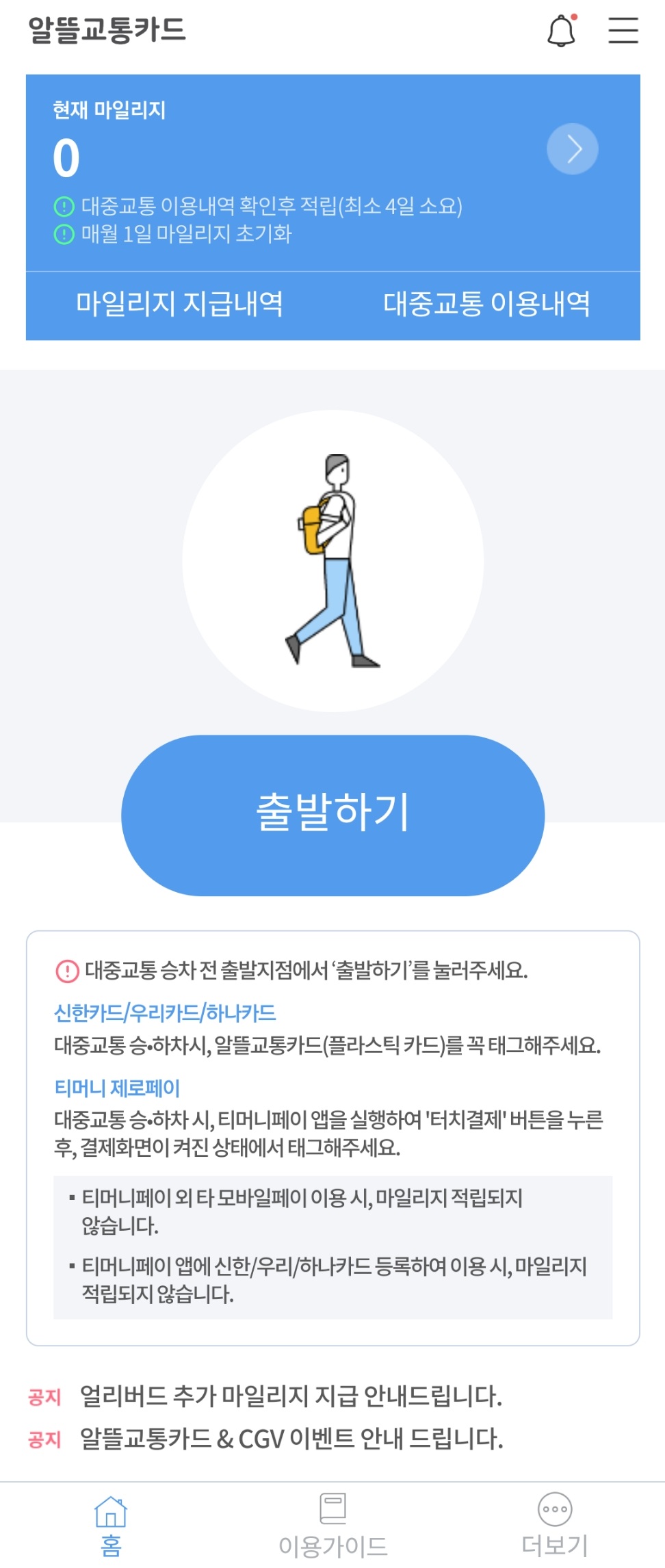 알뜰교통카드 앱은 회원이 대중교통 이용 시, 보행 및 자전거 등을 이용해 최초 출발한 지점부터 대중교통 승차지점까지, 대중교통 하차지점부터 최종 도착한 지점까지 이동한 거리에 따라