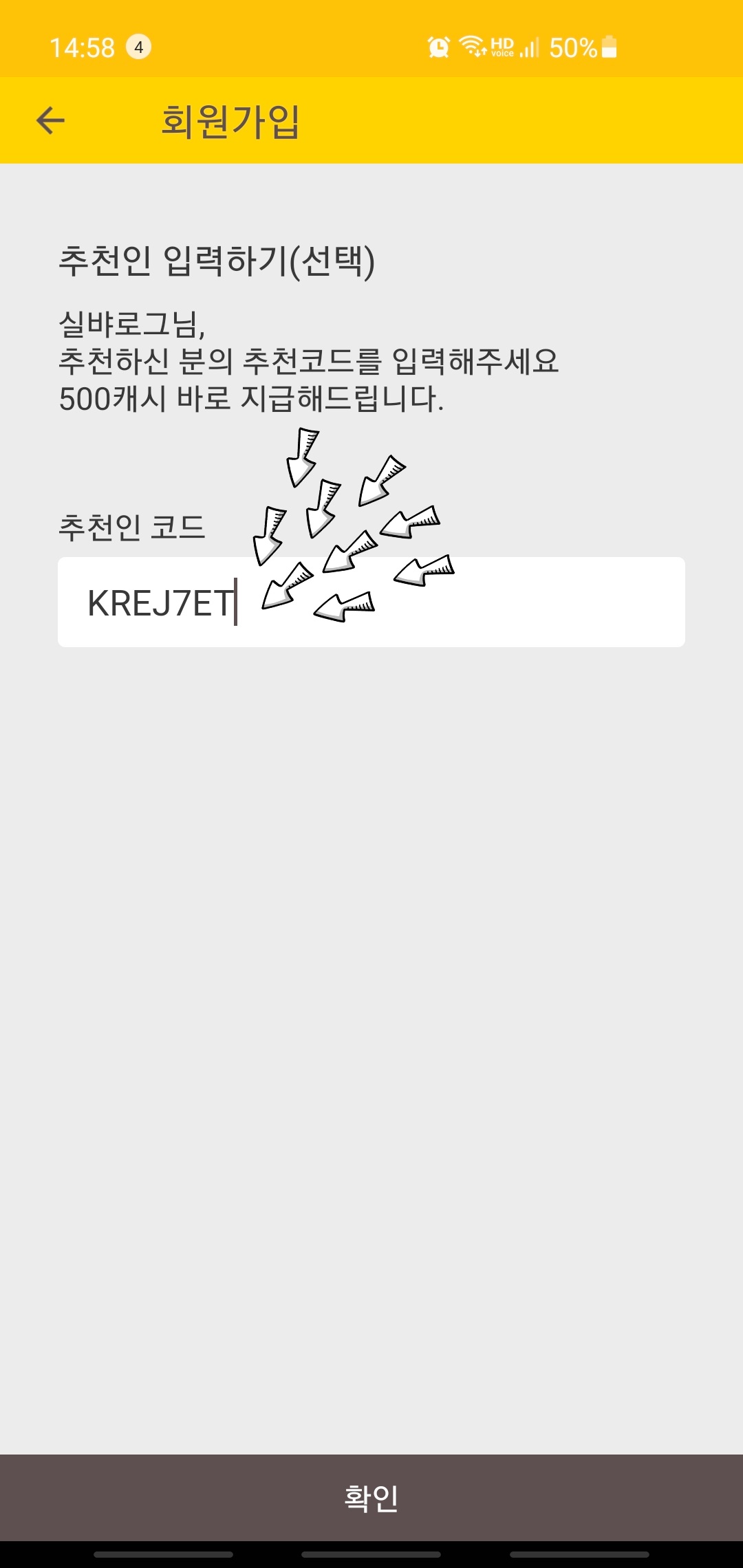 (추천인 입력 화면은 아래와 같습니다. 참고하여 추천인 코드 입력하여 500 캐시 지급받으세요!)