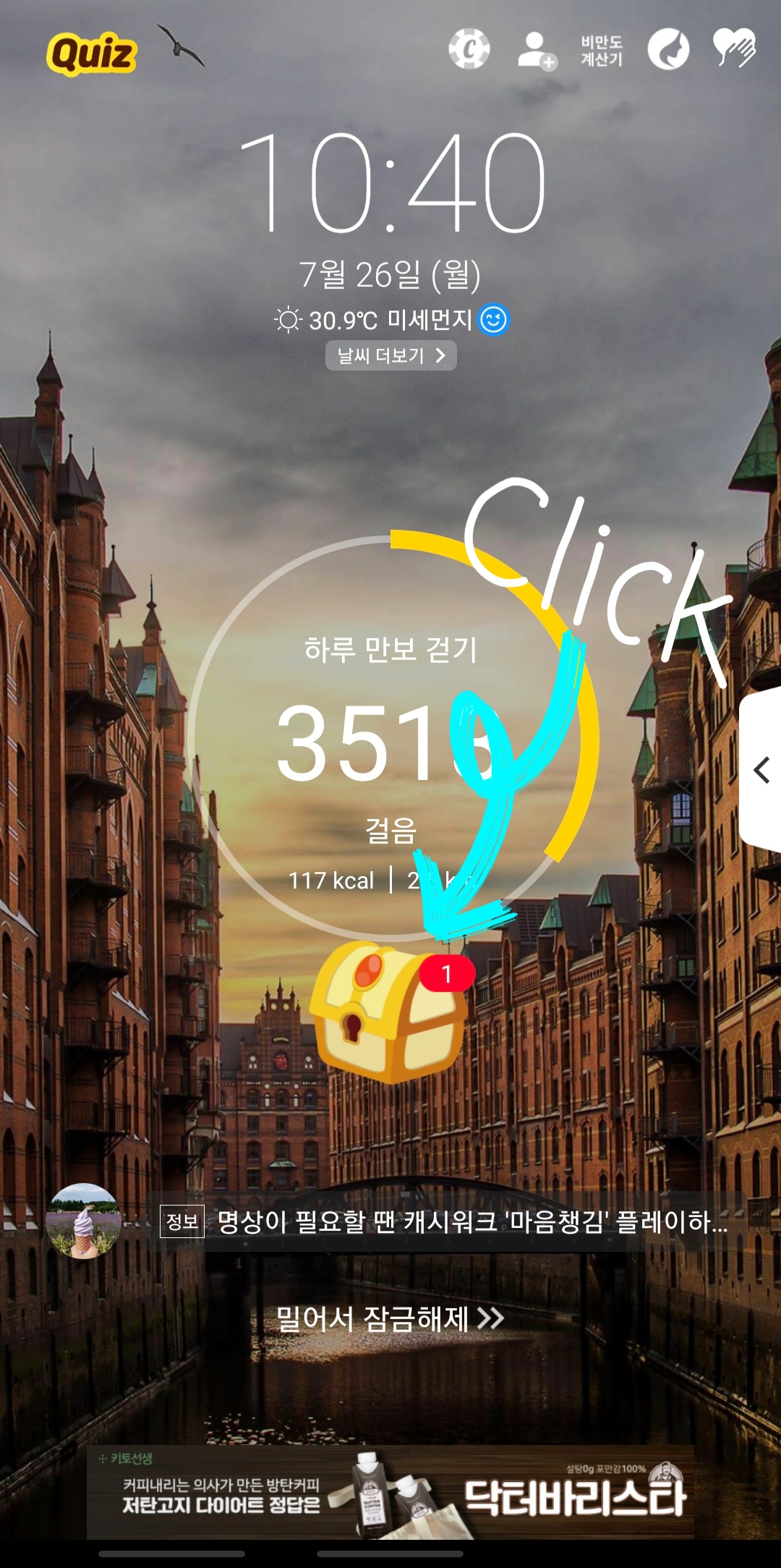 STEP 2. 하루 100 걸음 이상 적립된 경우 아래 이미지 외 같이 보석함에 숫자가 표시된 경우에 이 보석함 버튼을 클릭합니다.