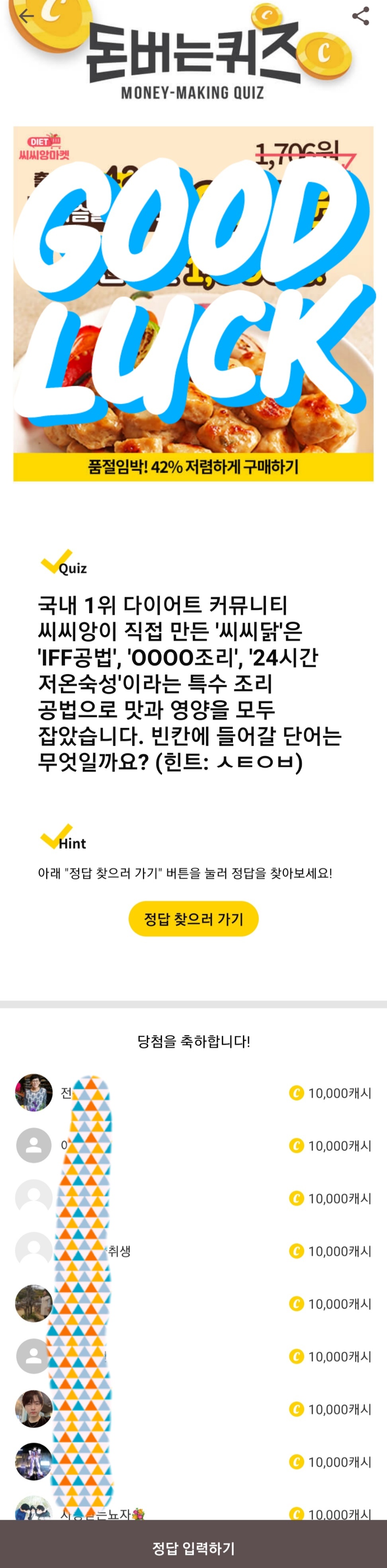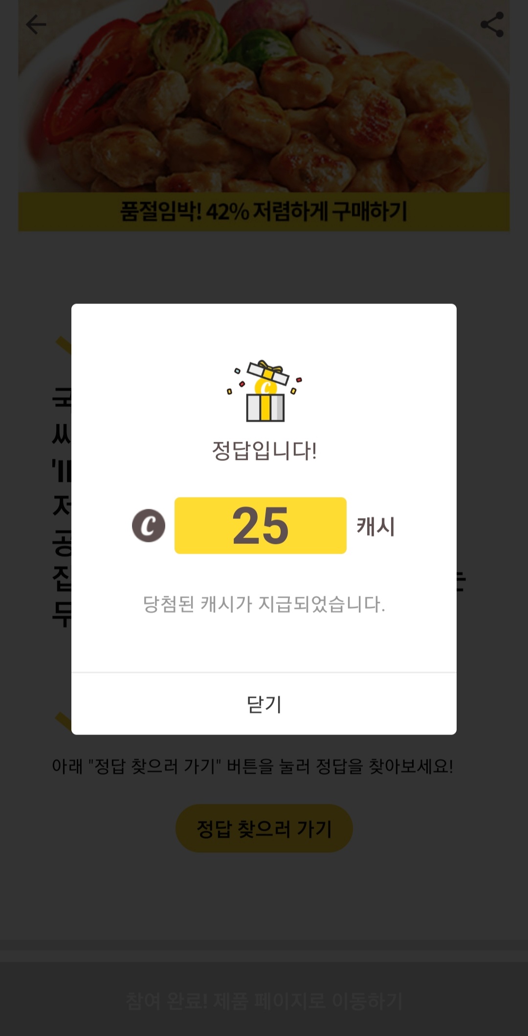 STEP 6. 정답인 경우 아래 이미지와 같이 표시되며, 적립되는 캐시는 퀴즈에 따라 다릅니다.