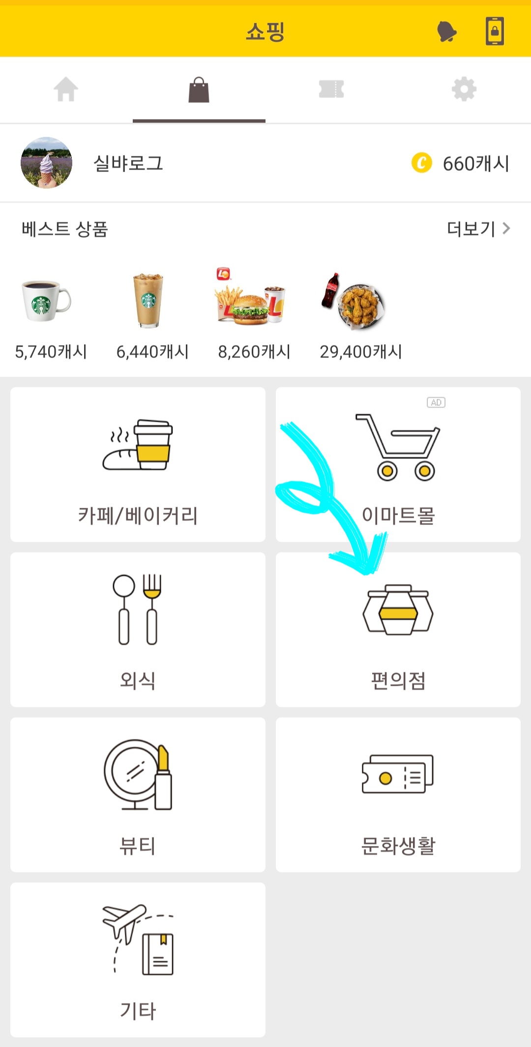 STEP 3. 구매하려는 상품을 파는 카테고리 버튼을 클릭합니다. (사탕의 경우 편의점 버튼 클릭)