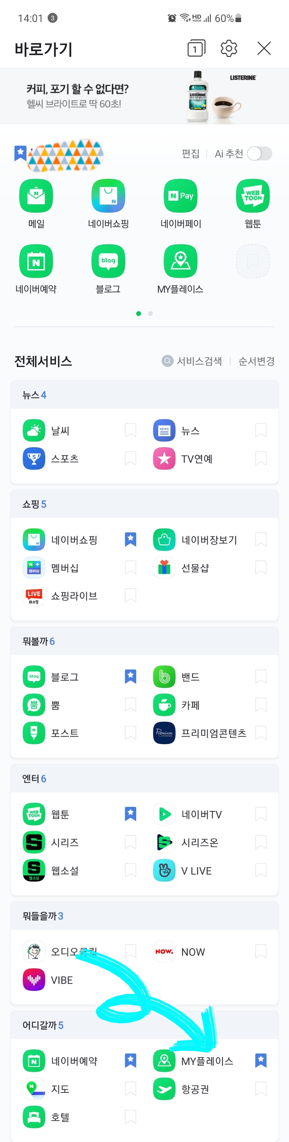 STEP 3. 화면을 스크롤하여 '어디갈까' 카테고리의 'MY플레이스'를 클릭합니다.