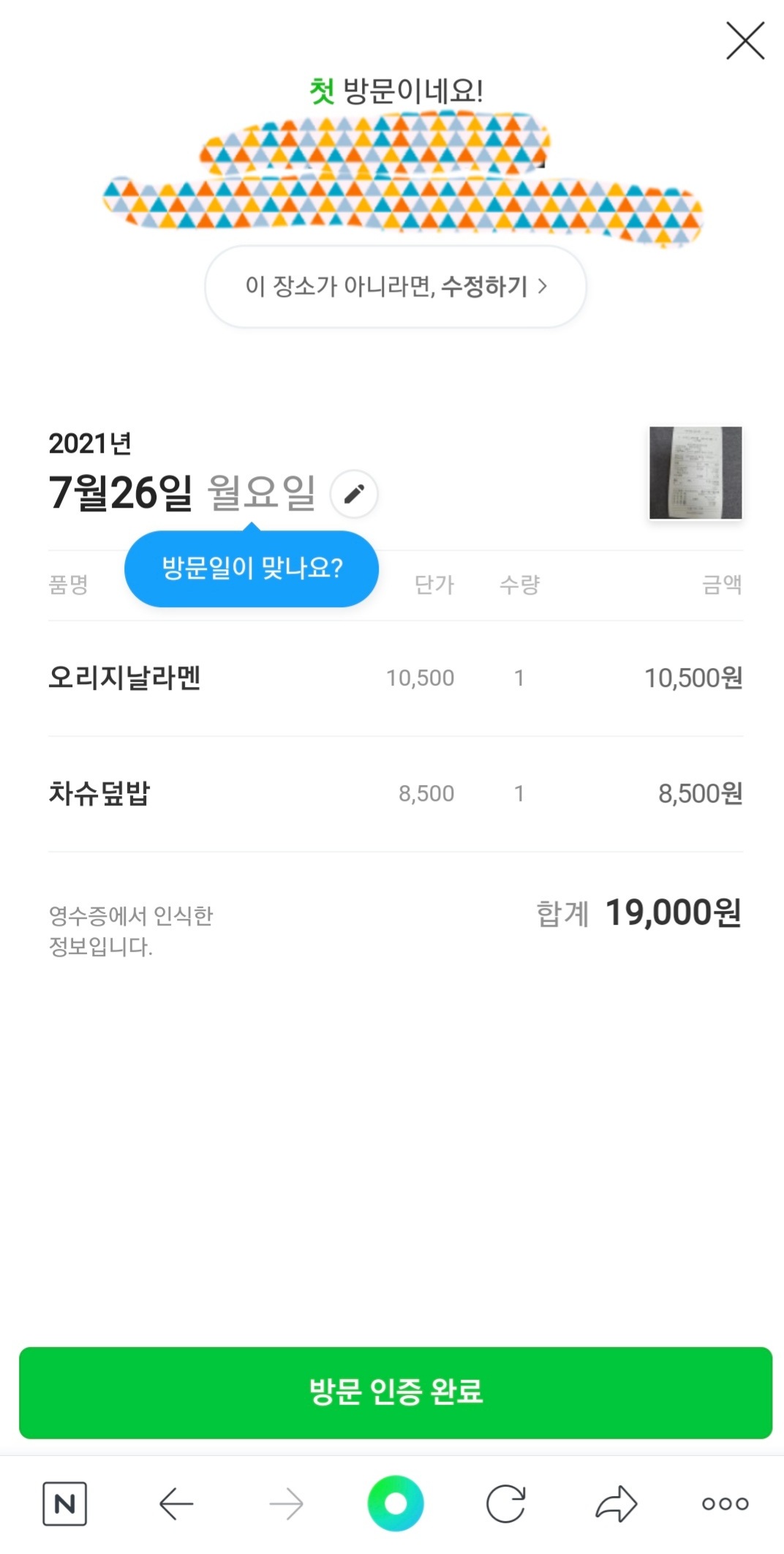 STEP 5. 카메라로 영수증 촬영 혹은 앨범에서 촬영한 영수증을 클릭한 후, 정상적으로 인식되면 화면 하단의 '방문 인증 완료' 버튼을 클릭합니다.